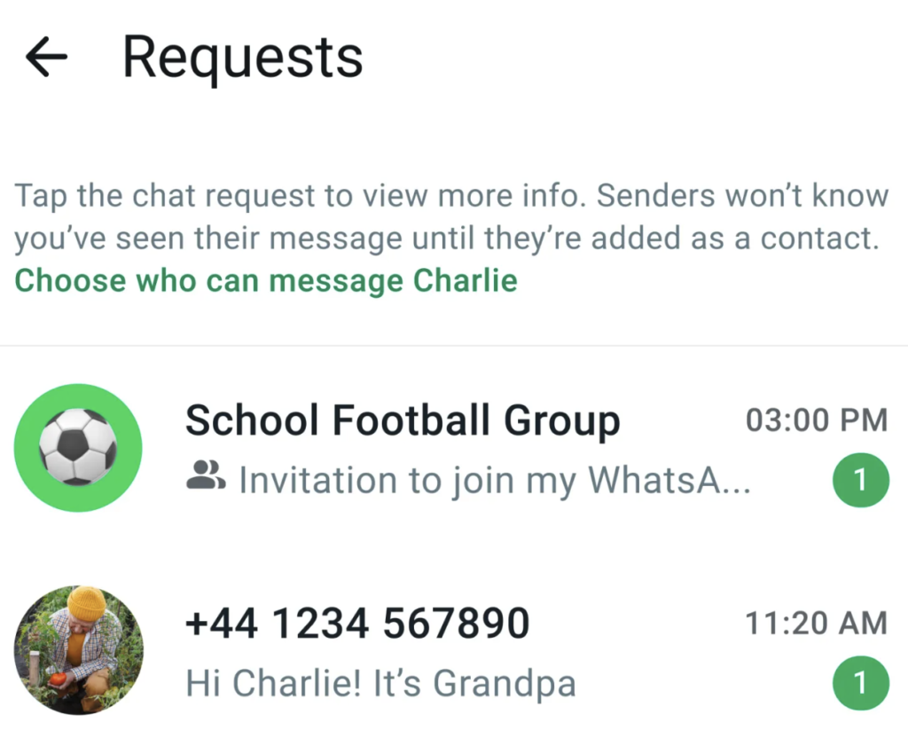 Chat requests from unknown users are placed in a separate folder that can only be accessed with the parent’s PIN. Similarly, group invite links require parental approval before the child can join.